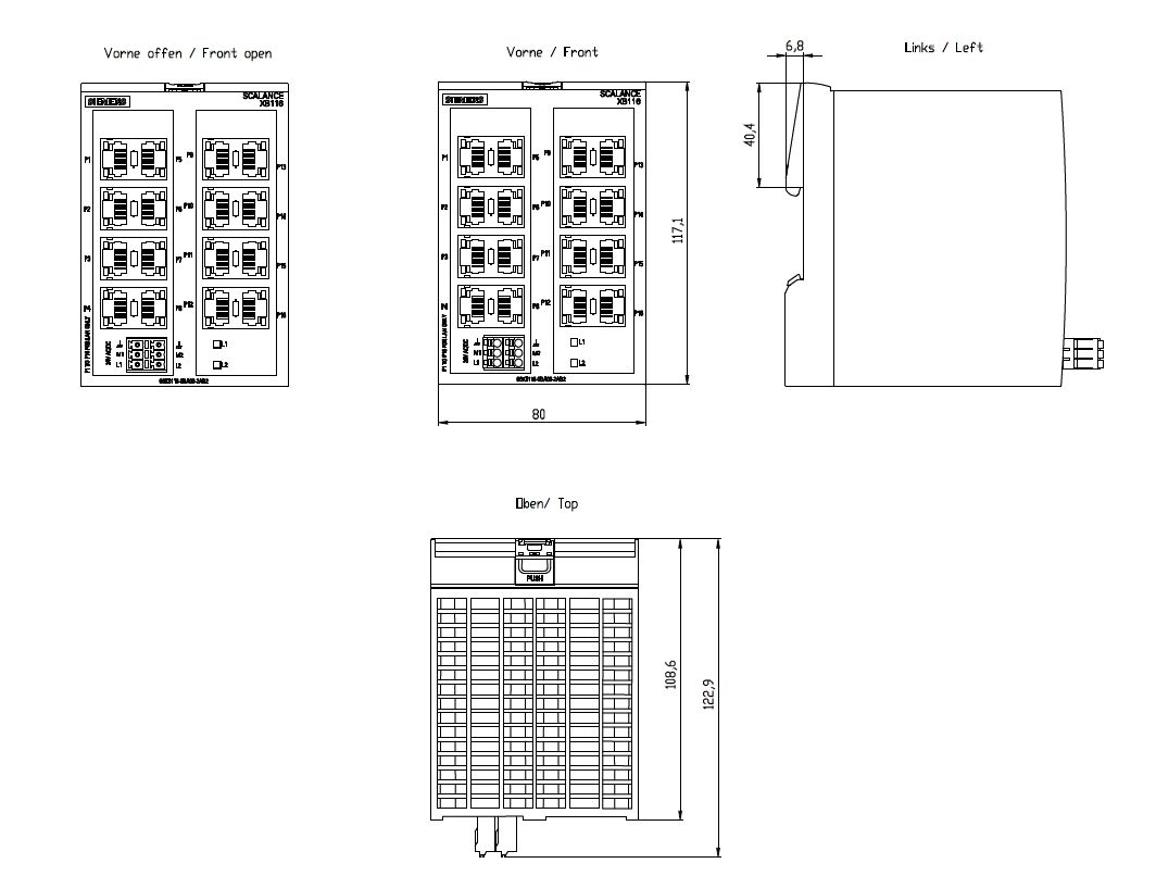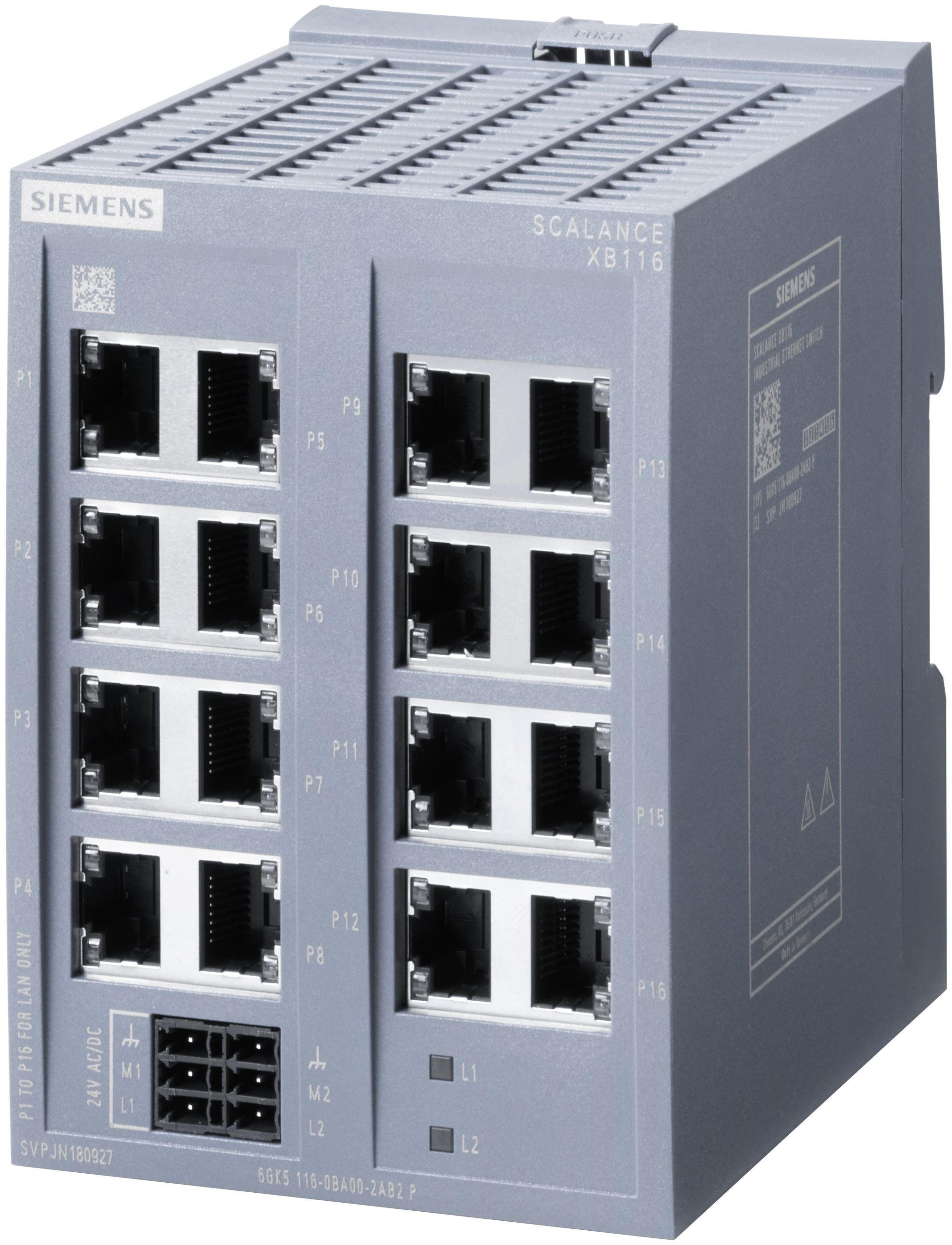 SCALANCE XB116 je nekonfigurovatelný průmyslový switch, který zajišťuje spolehlivou a odolnou síťovou infrastrukturu s 16x 10/100 Mbit/s RJ45 porty.