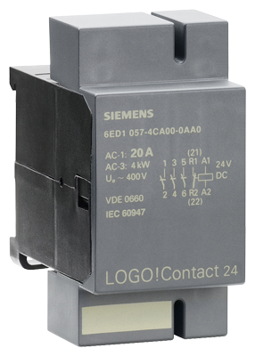 LOGO! Stykač 24 VDC is designed for controlling resistive loads up to 20 A and motors up to 4 kW.