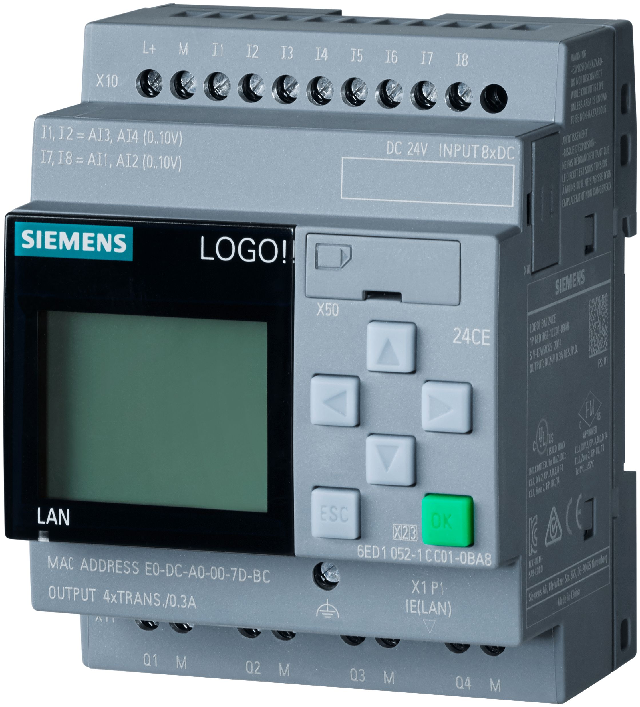 85239 | 6ED1052-2MD08-0BA2 SIEMENS 6ED1052-2MD08-0BA2, Programovatelný automat bez displeje s napájením 12VDC/24VDC,V8.4 LOGO! 12/24RCEO, 8DI/4DO,výst.relé,hod.,400 bloků, web server, SD card |