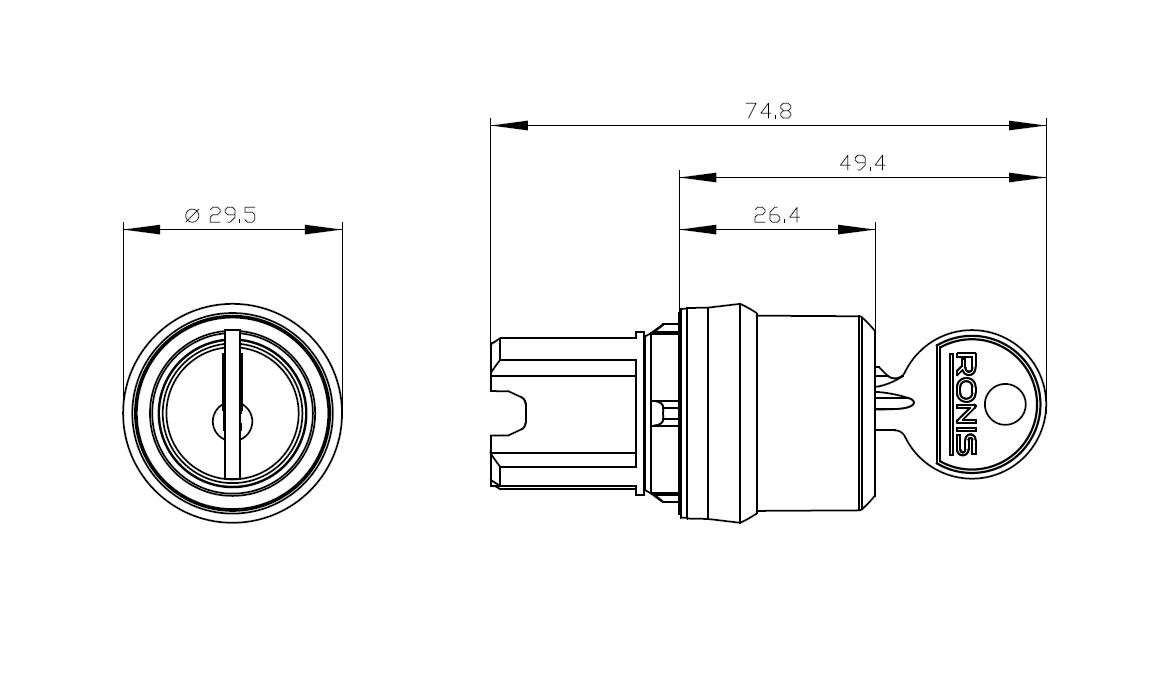 Klíčový spínač RONIS s 2 klíči a 3 spínacími polohami je ideální pro zajištění přístupové bezpečnosti.